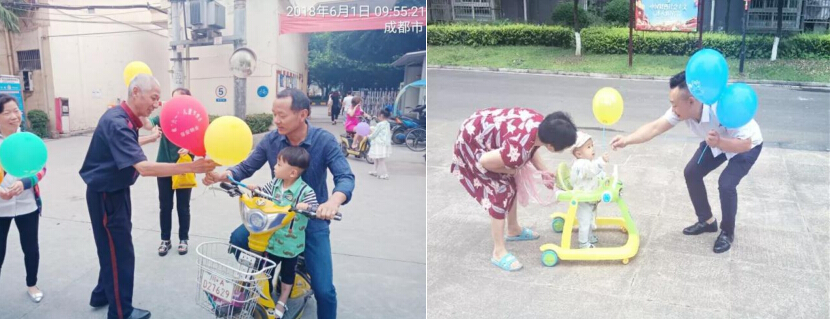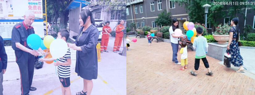居安物业开展 “ 送气球 ” 活动庆祝 “ 六 · 一 ” 儿童节 为使各位家长、小朋友充分感受到六·一儿童节的氛围,2018 年 年 6 月 月 1 日 上午,成都居安物业服务有限责任公司组织各小区工作人员为小朋友们发放可爱 的气球来庆祝这个快乐的节日,小区里面到处都洋溢着欢声笑语。